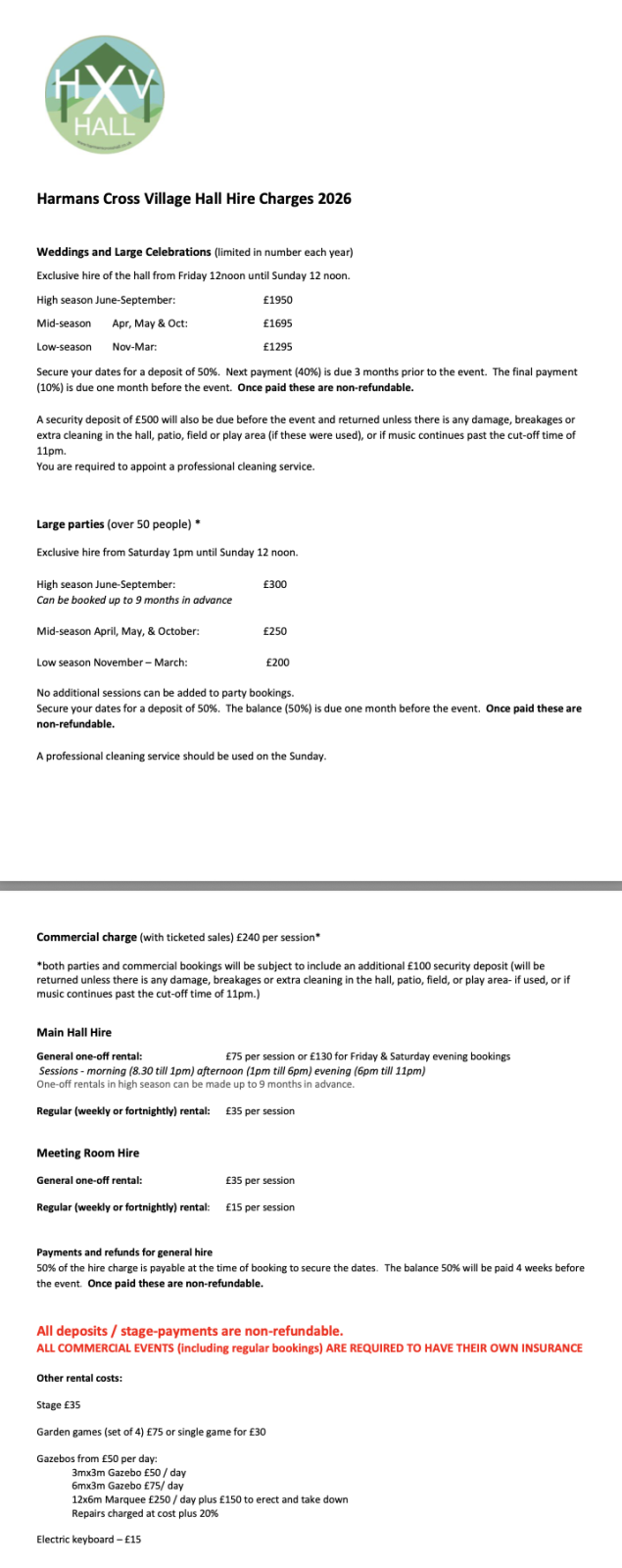 Please click on the link below to open a PDF document which summarises hiring costs for Harmans Cross Village Hall for the period 1st January 2026 to 31st December 2026.